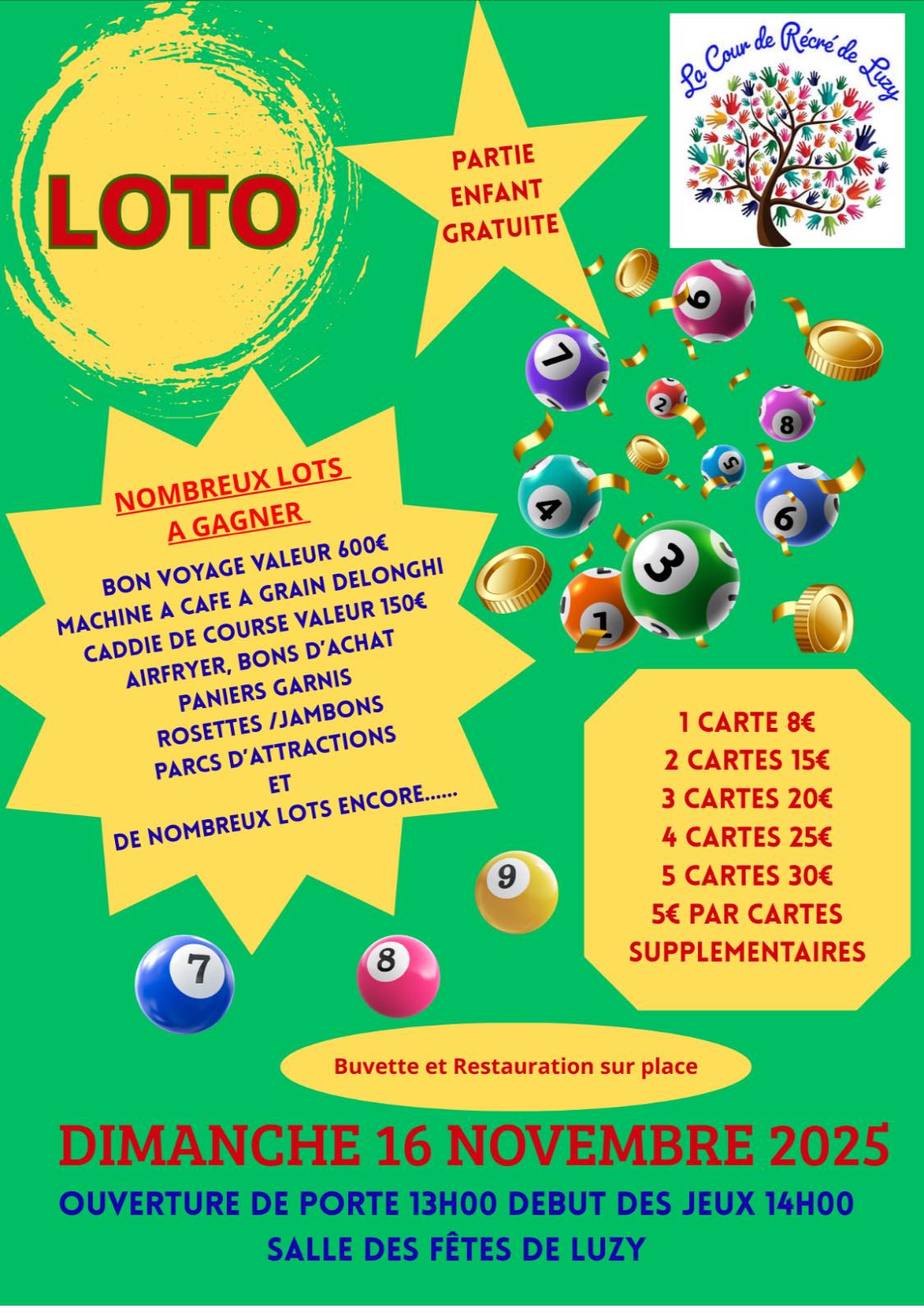 DIMANCHE 26 OCTOBRE 2025 !!!!!!!Ouverture des portes à 13hJeux à 14hSalle des fêtes de Luzy (58170)Plus de 2500€ de lots seront à gagner tout l'après midi!+1000€ chèques cadeaux Achetez à Luzy, Colis de viande ...
