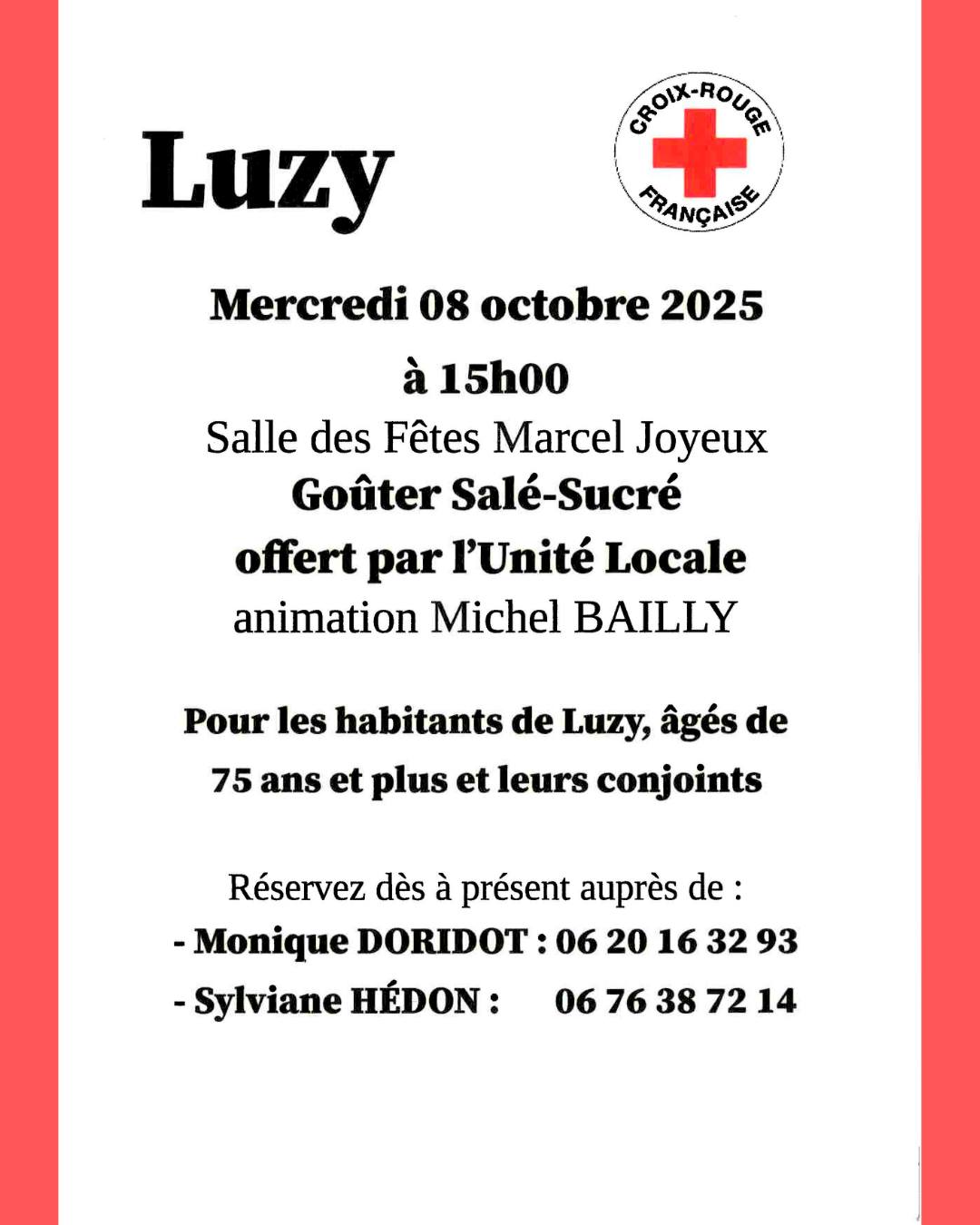 L’unité Locale de la Croix-Rouge vous convie à son goûter salé-sucré, animé par Michel BAILLY ! Ce moment convivial est ouvert aux habitants de Luzy et leurs conjoints, à partir de 75 ans.