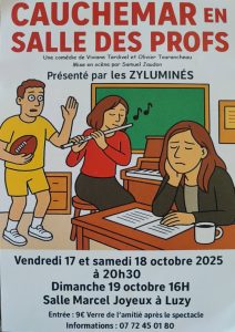 Pièce de théâtre "cauchemar en salle des profs " de Viviane Tardivel et Olivier Tourancheau, mise en scène par Samuel Jaudon. Vendredi 17 octobre à 20h30 ; Samedi 18 octobre…