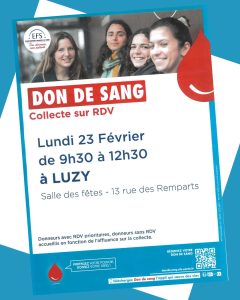 Lundi 23 février 2026 - de 9h30 à 12h30 // Salle des Fêtes de Luzy Avec l'Etablissement Français du Sang et l'amicale des donneurs de sang, #sauvonsdesviesensemble ! 1 DON…